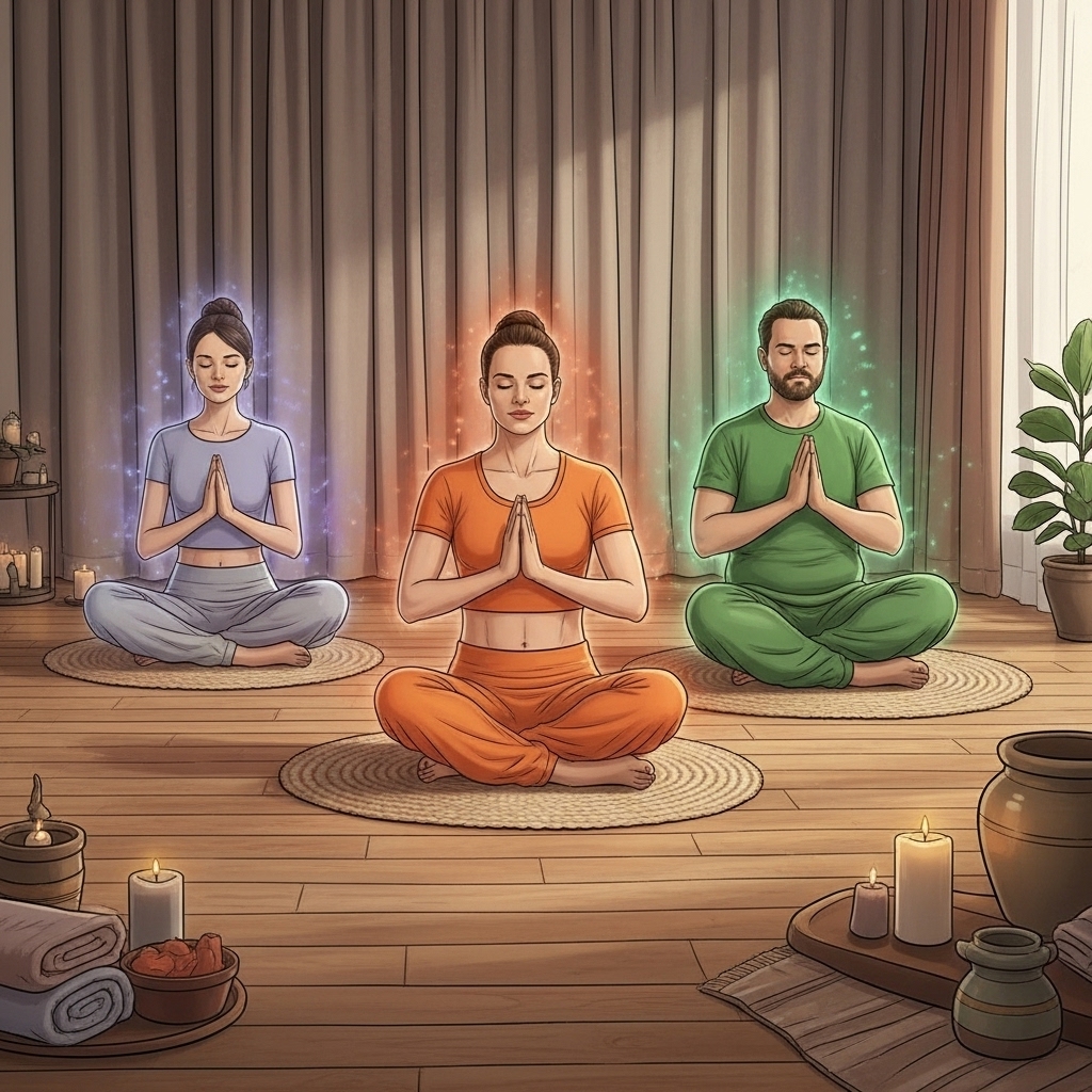 Kapha 🌱: Complexión robusta, metabolismo lento y carácter tranquilo. Aquí se aplican aceites estimulantes y aromas energéticos, acompañados de música rítmica para reactivar cuerpo y mente.